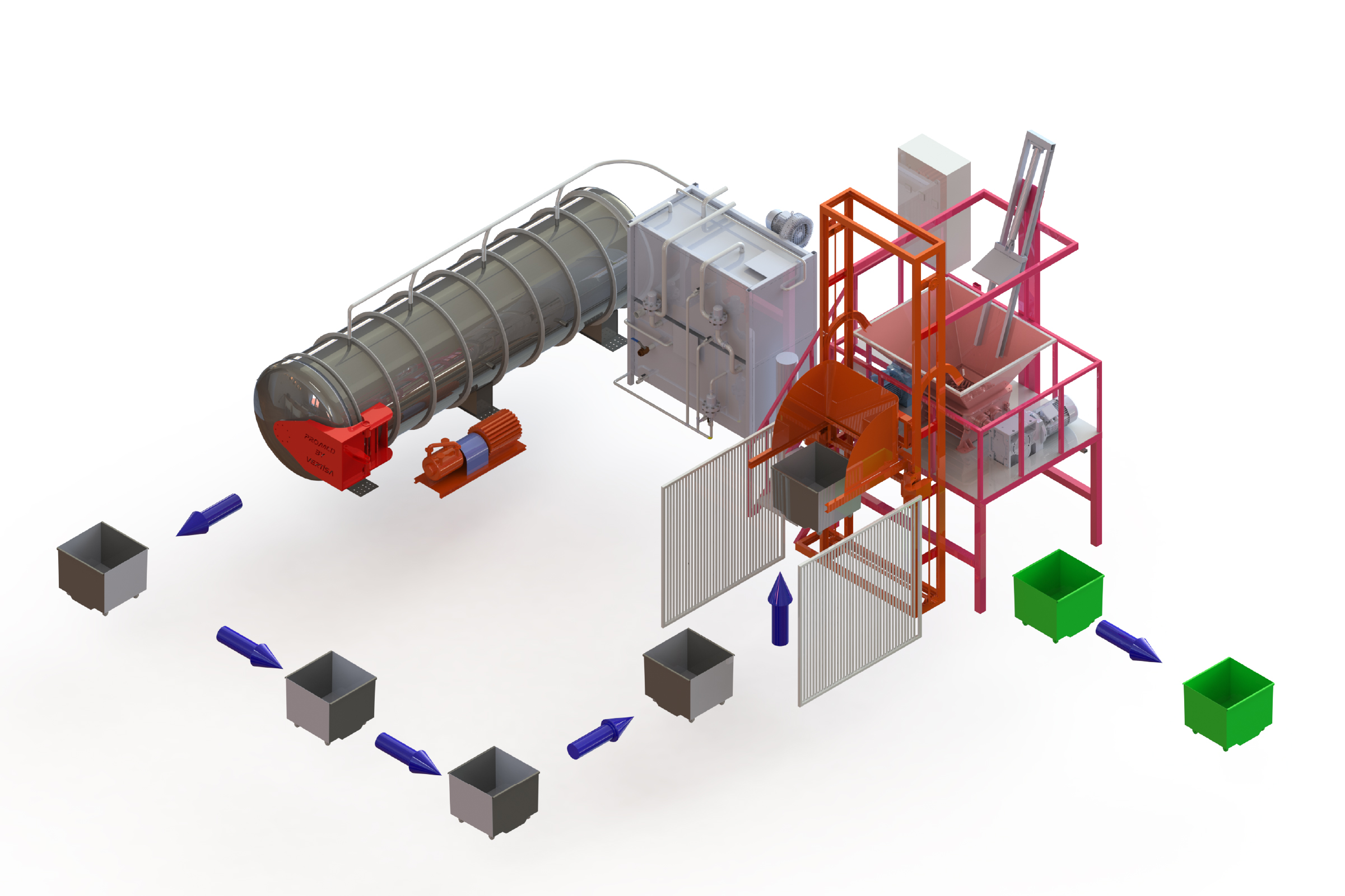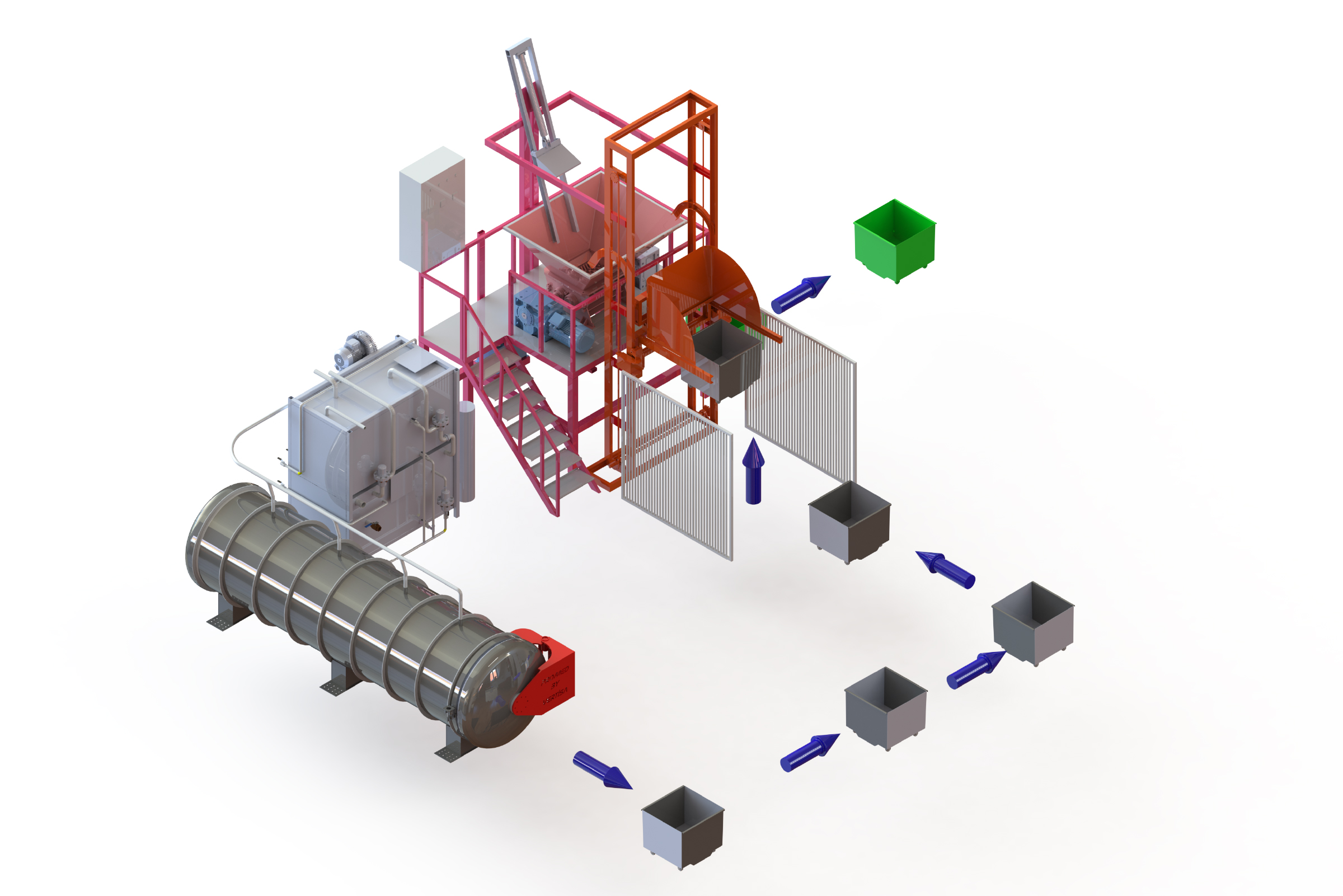 Sistema ideal para Hospitales de Gran Tamaño e Instalaciones de Esterilización Industrial. Proceso simultáneo de trituración y esterilización para una mayor capacidad de producción. Rampa automática de carga y descarga de los carros del autoclave. Sistema de elevación automático para facilitar la carga.