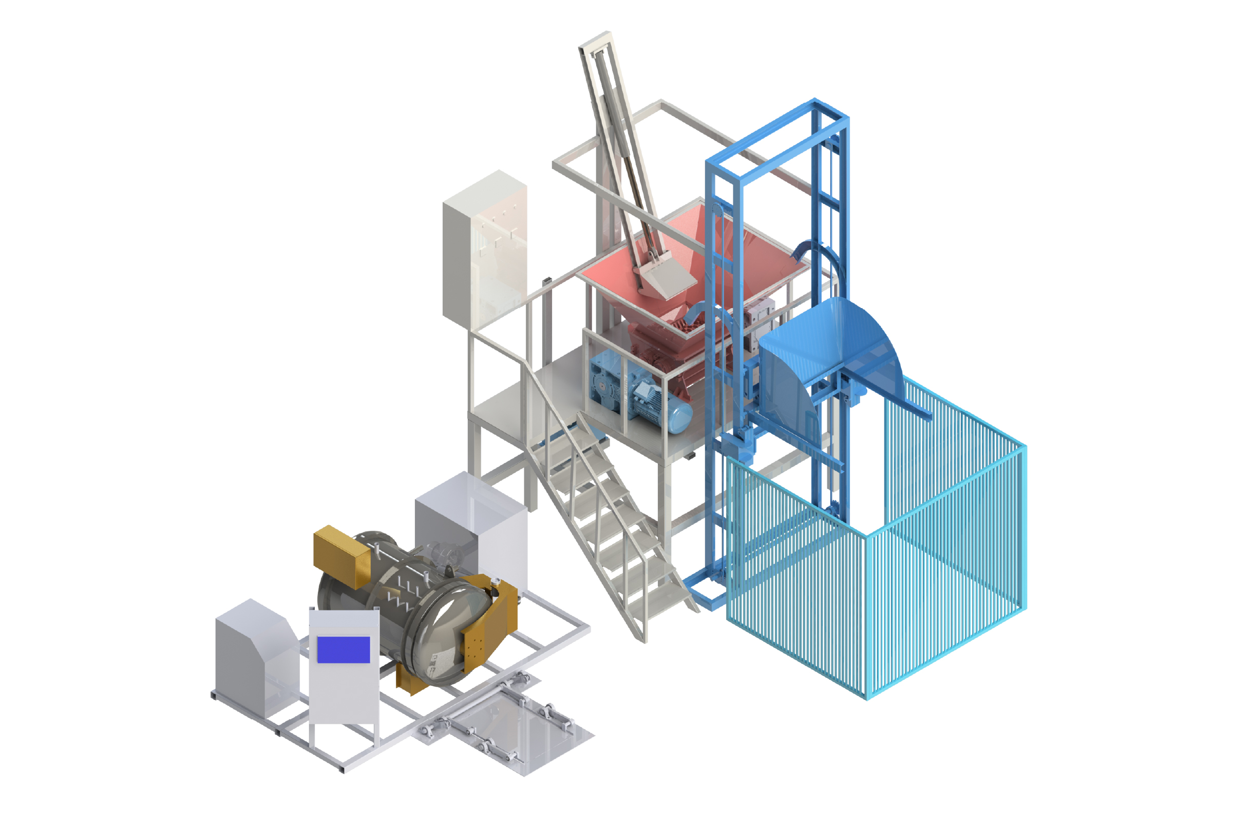 Sistema Post-Triturador, diseño para pequeños hospitales y clínicas. Proceso simultáneo de trituración y esterilización para una mayor capacidad de producción.