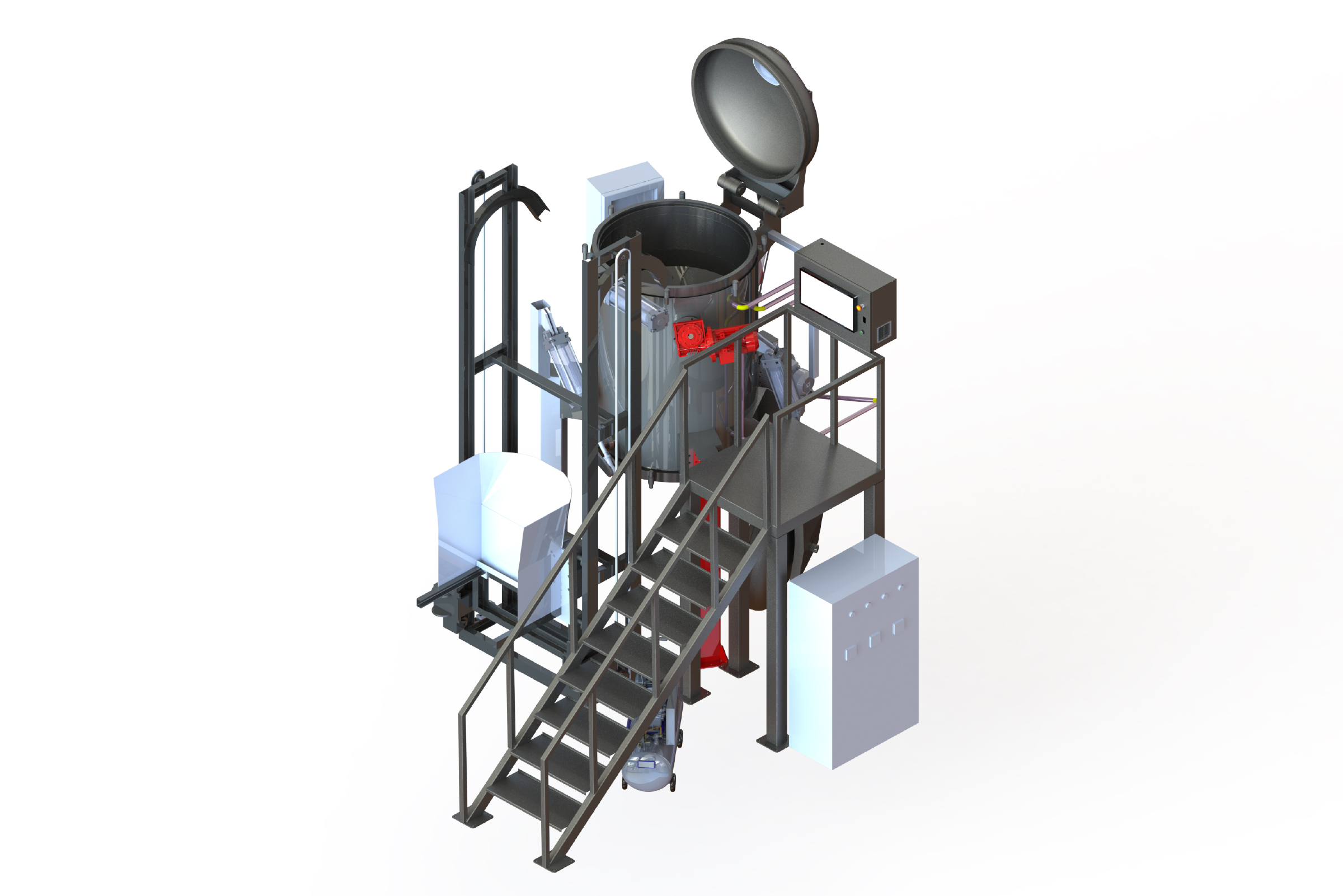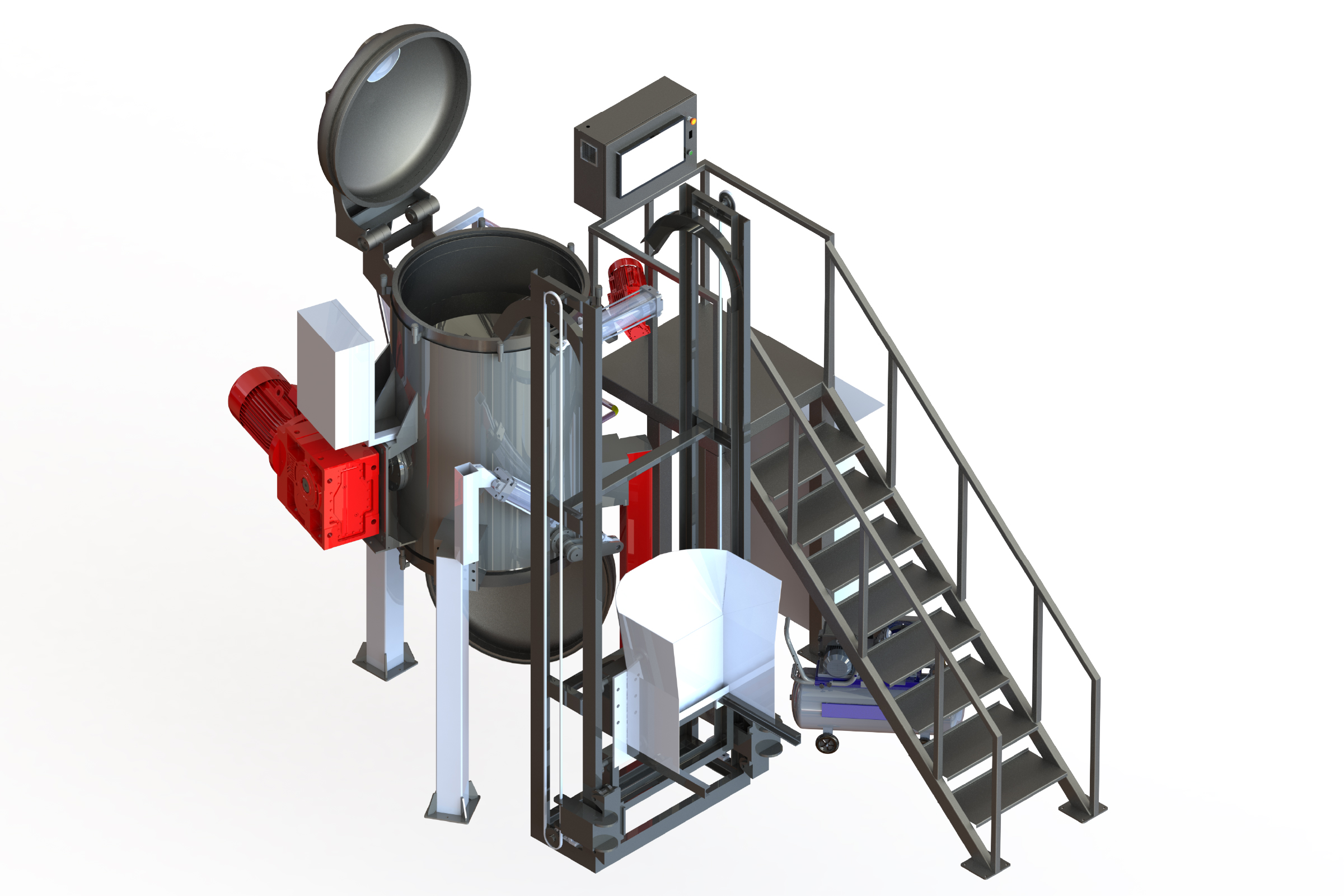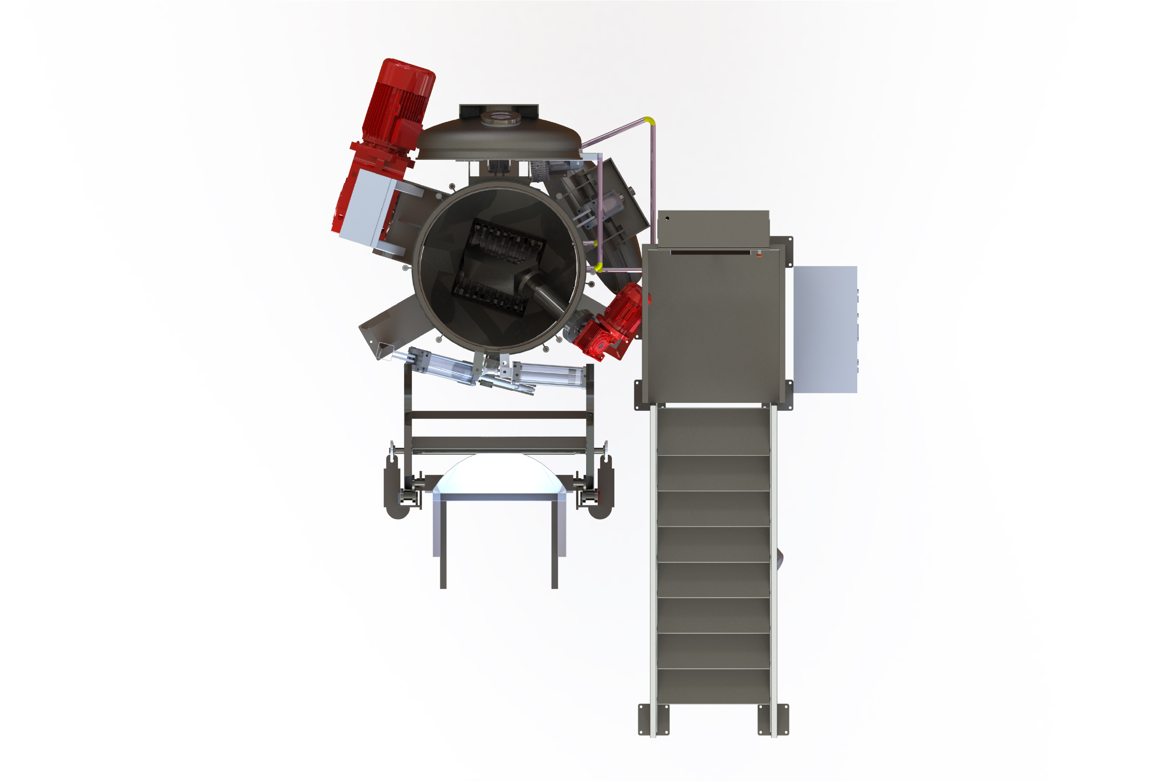 Sistema de pre-trituración vertical. Ideal para hospitales de gran tamaño e industriales. Sistema de ascensor automático para fácil carga. Sofisticado sistema de control de automatización con programa avanzado de informes y monitoreo